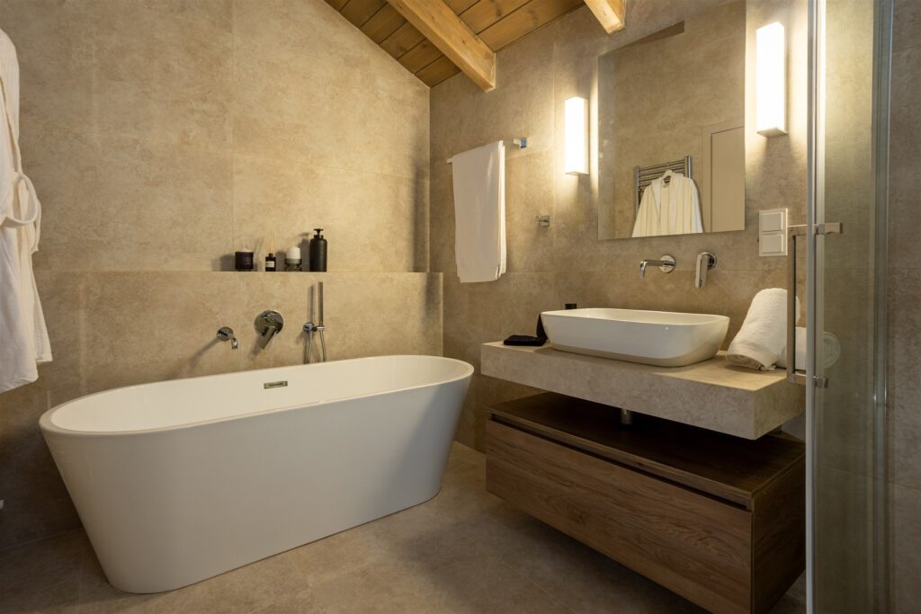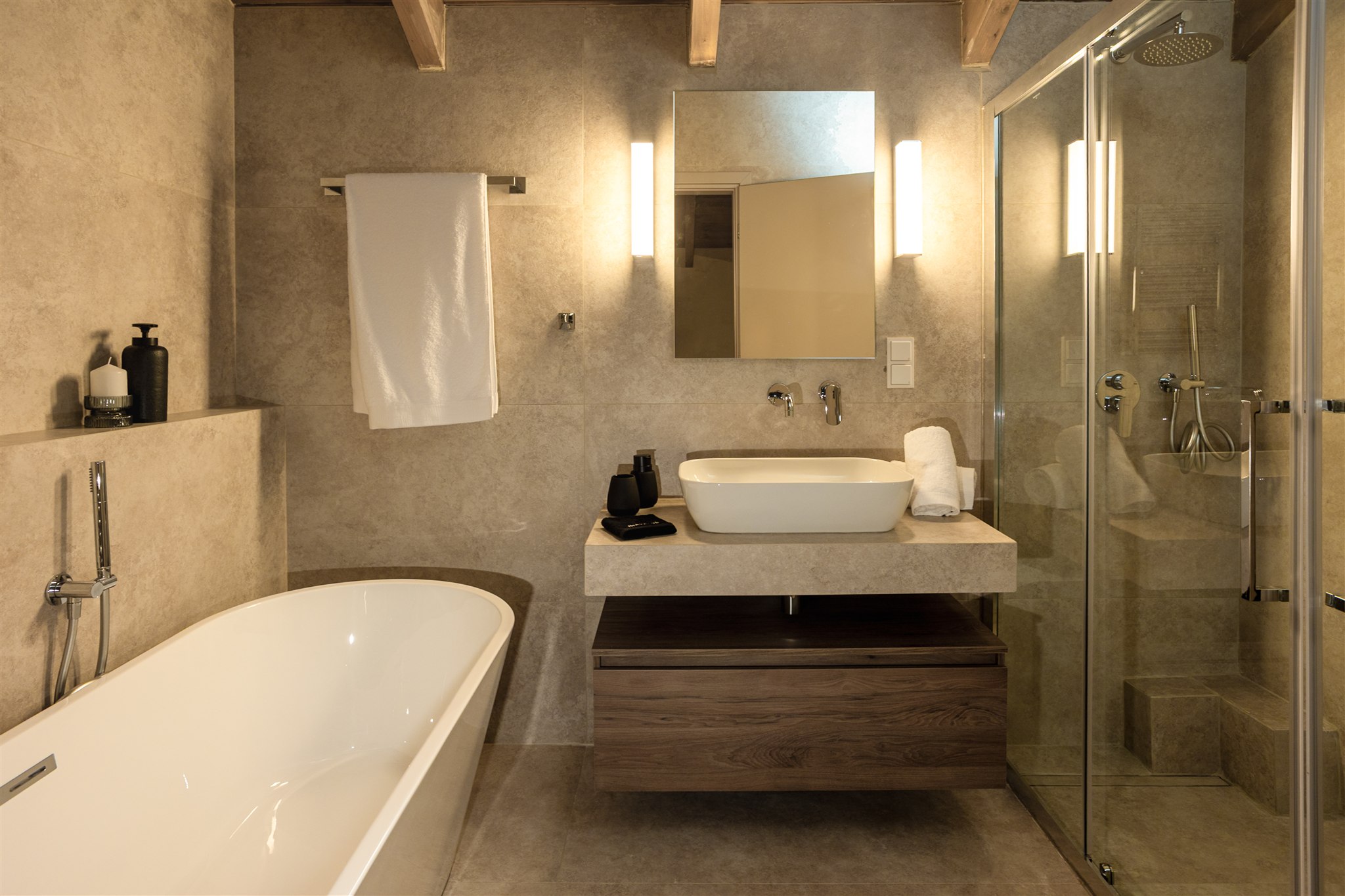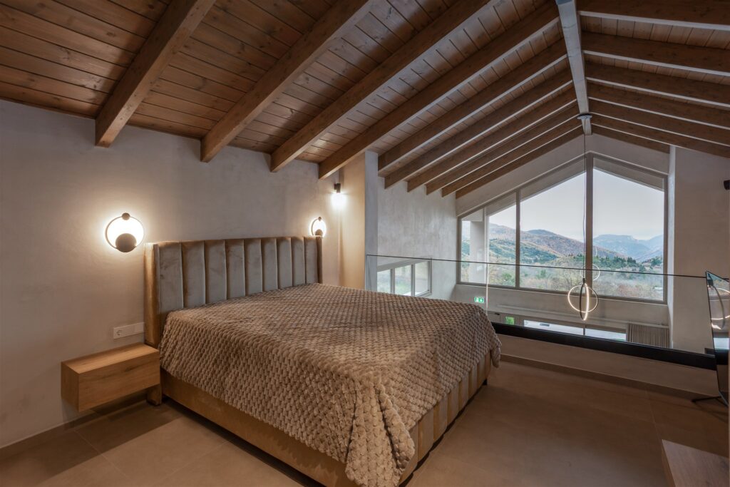 Each villa features a pool with mountain views and a cozy fireplace for year-round enjoyment. With a private entrance, the villa includes one inviting living room, three separate bedrooms, and two bathrooms, featuring both a walk-in shower and a relaxing bathtub.